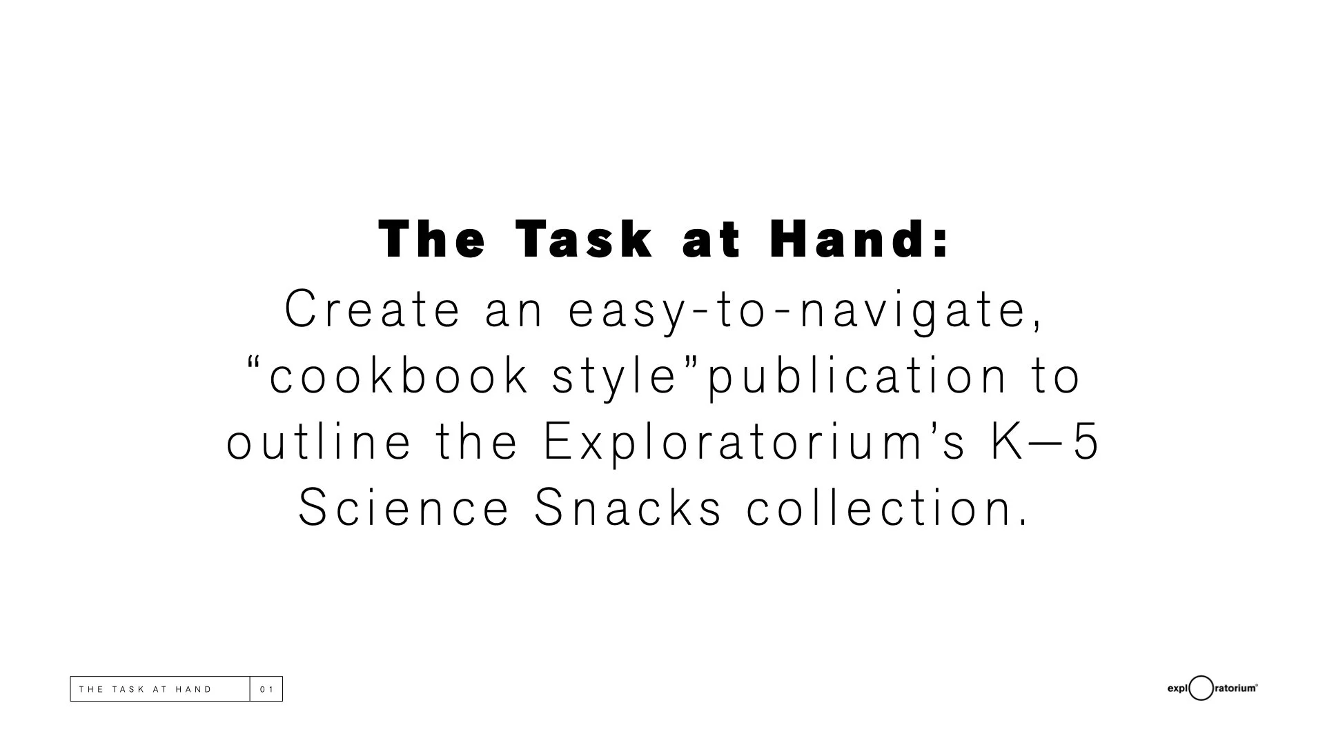 The Task at Hand: Create an easy-to-navigate “cookbook style” publication to outline the Exploratorium’s K–5 Science Snacks experiments.