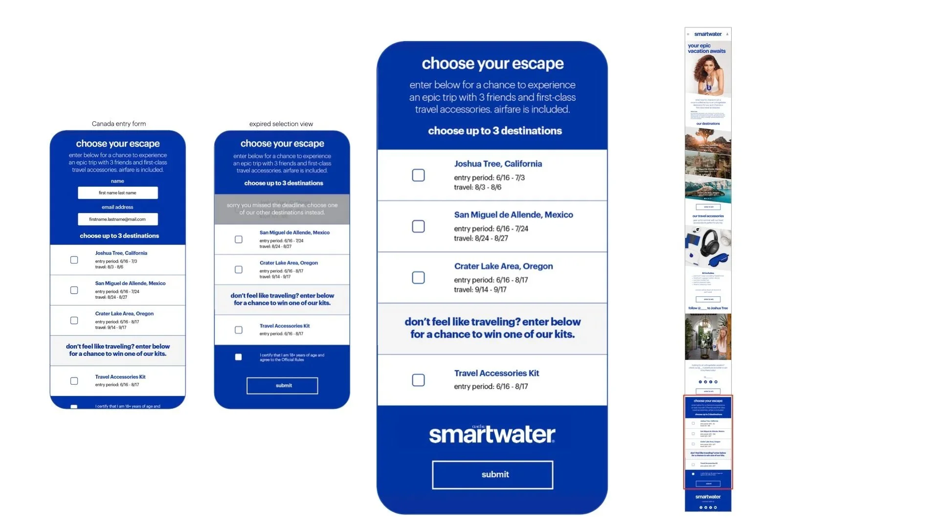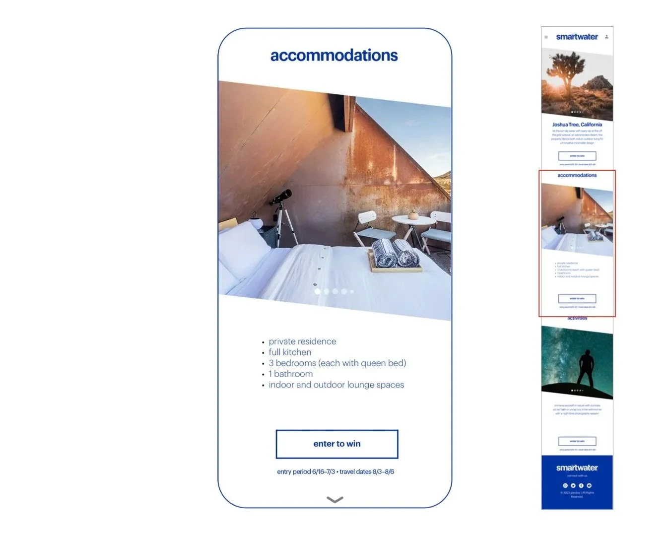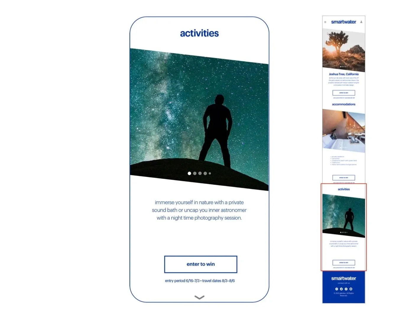Smartwater is all about providing unconventionally smart hydration. So when they run a summer sweeps promotion, it has to be equally unconventional. To do that, we partnered with Modern Adventure to offer incredibly unique summer getaway experiences at a few truly unconventional destinations. To ground the campaign, we designed a sleek and modular microsite. The goal was to make it easy to navigate while remaining flexible for changing promotional content.