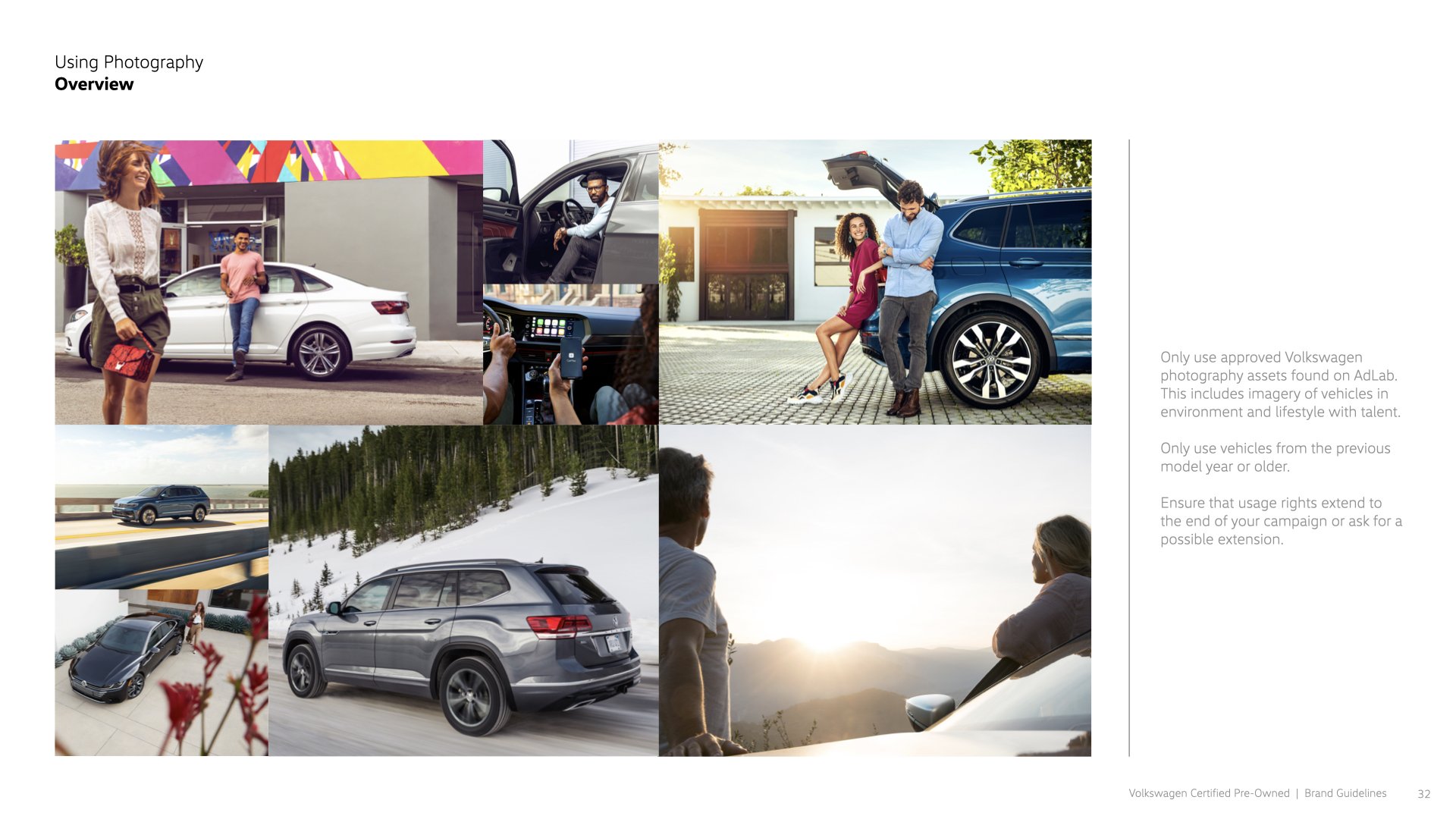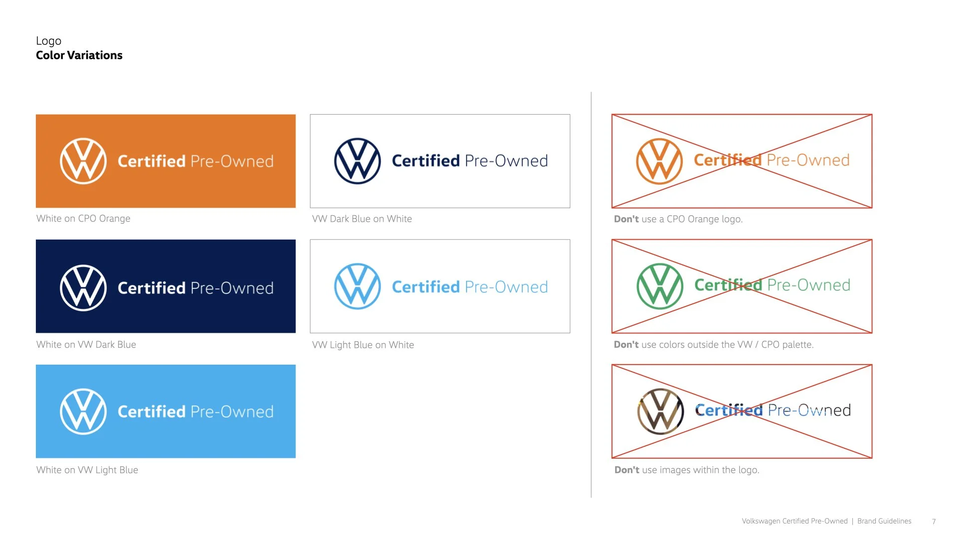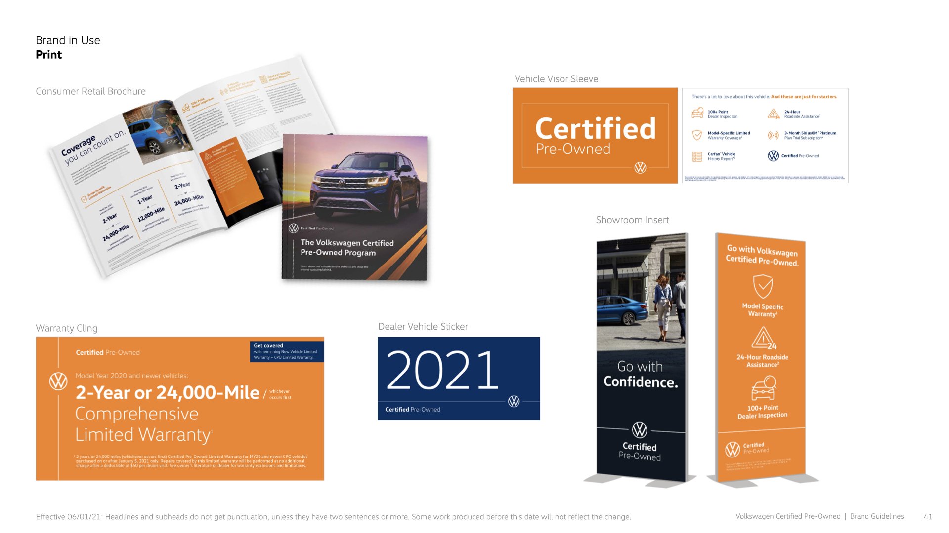 In a changing new car landscape, Volkswagen Certified Pre-Owned had the opportunity to get both consumers and dealers excited about pre-owned vehicles. Our task was to create a new brand assets, brand standards, templates for dealers, and put it all together in one easy-to-navigate brand guide.