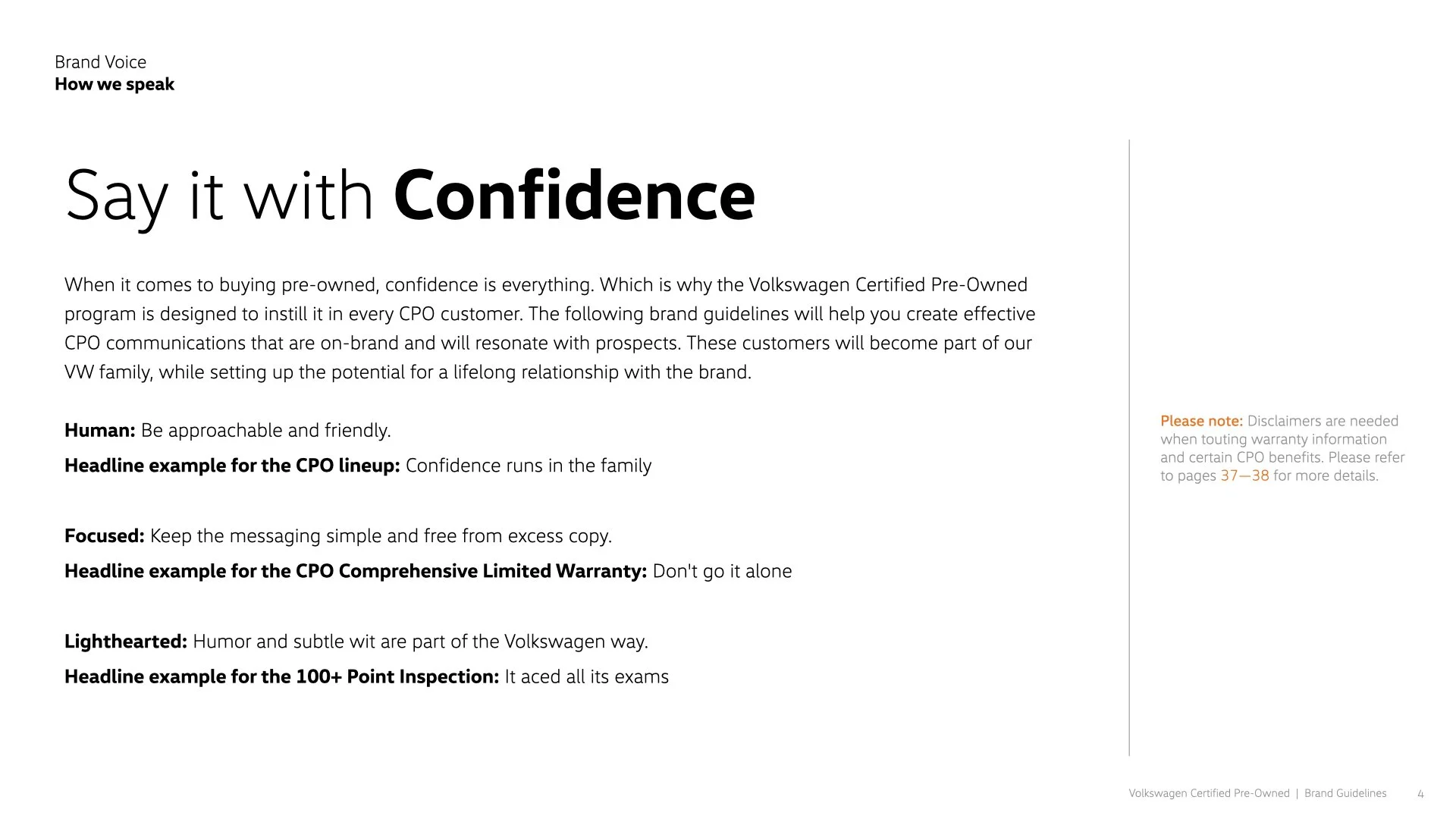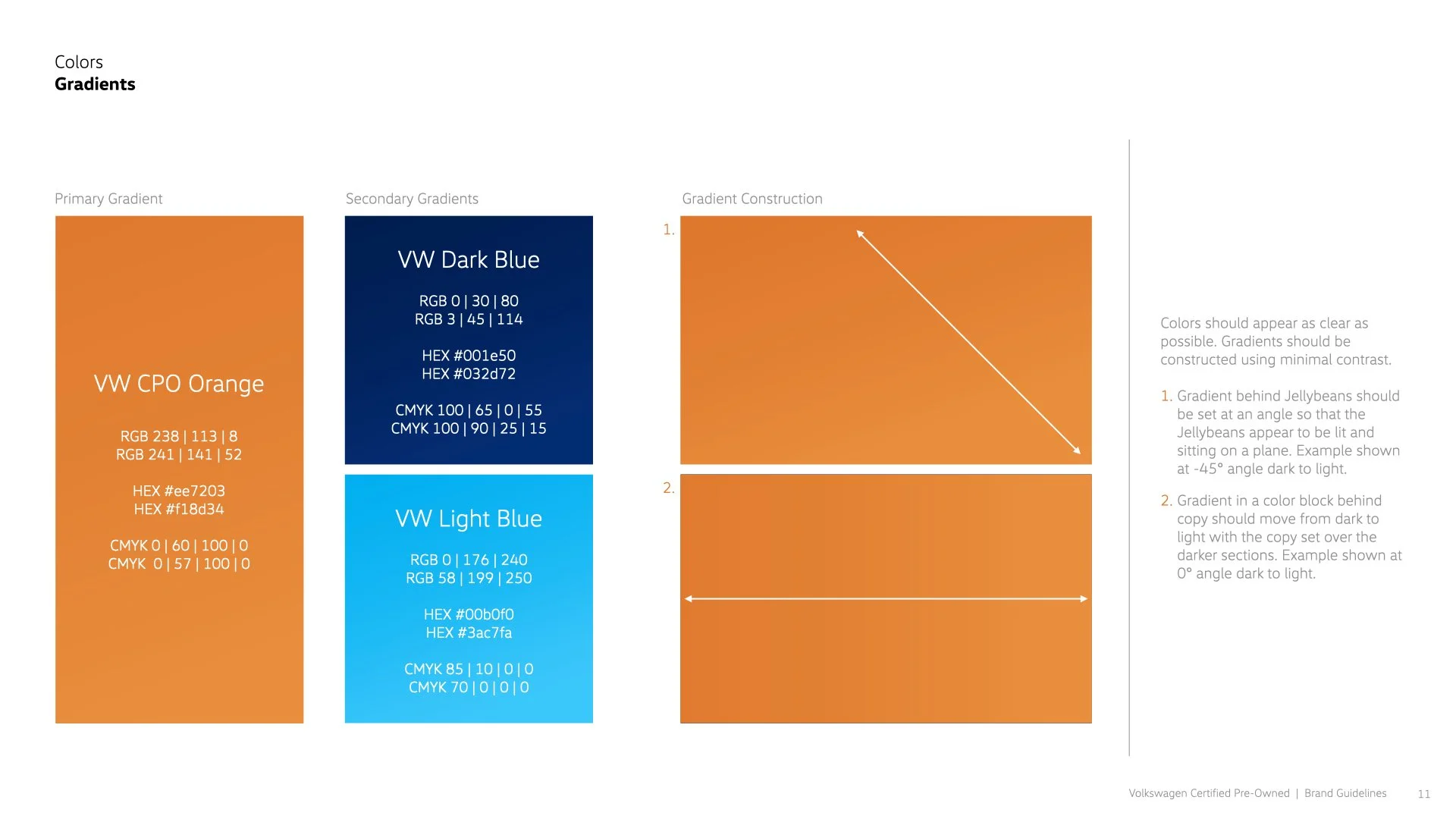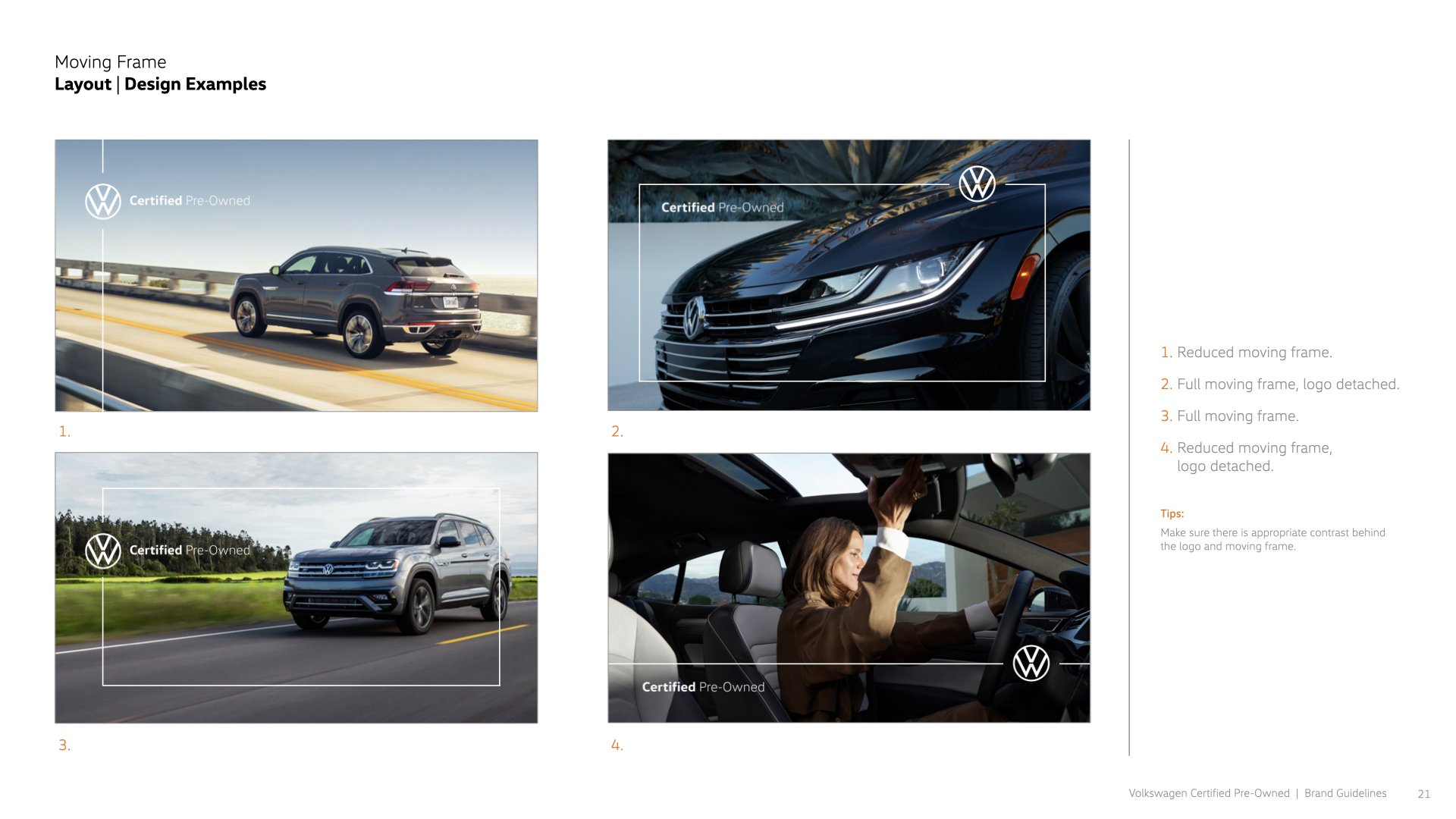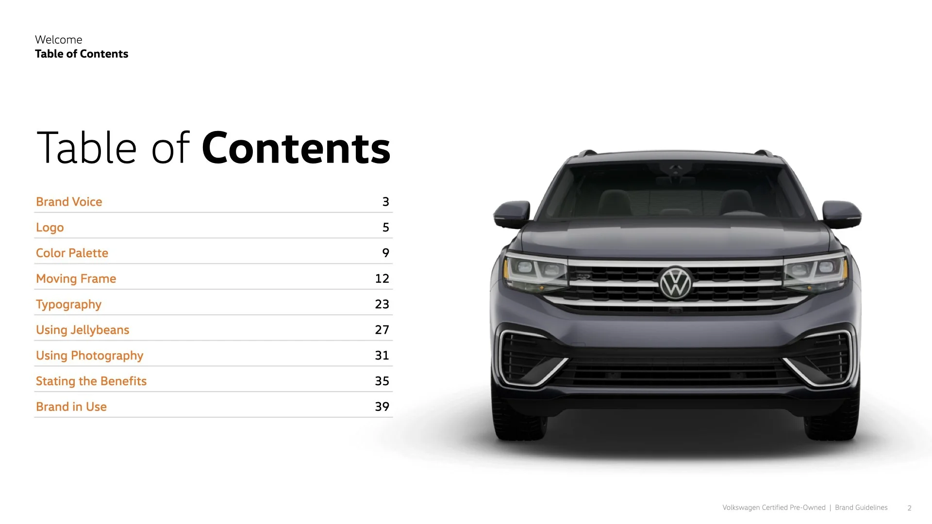 In a changing new car landscape, Volkswagen Certified Pre-Owned had the opportunity to get both consumers and dealers excited about pre-owned vehicles. Our task was to create a new brand assets, brand standards, templates for dealers, and put it all together in one easy-to-navigate brand guide.