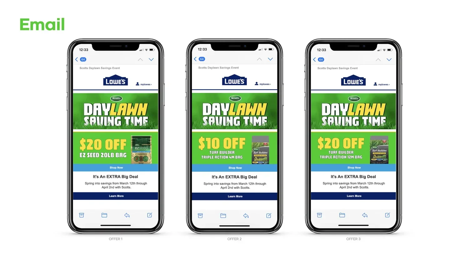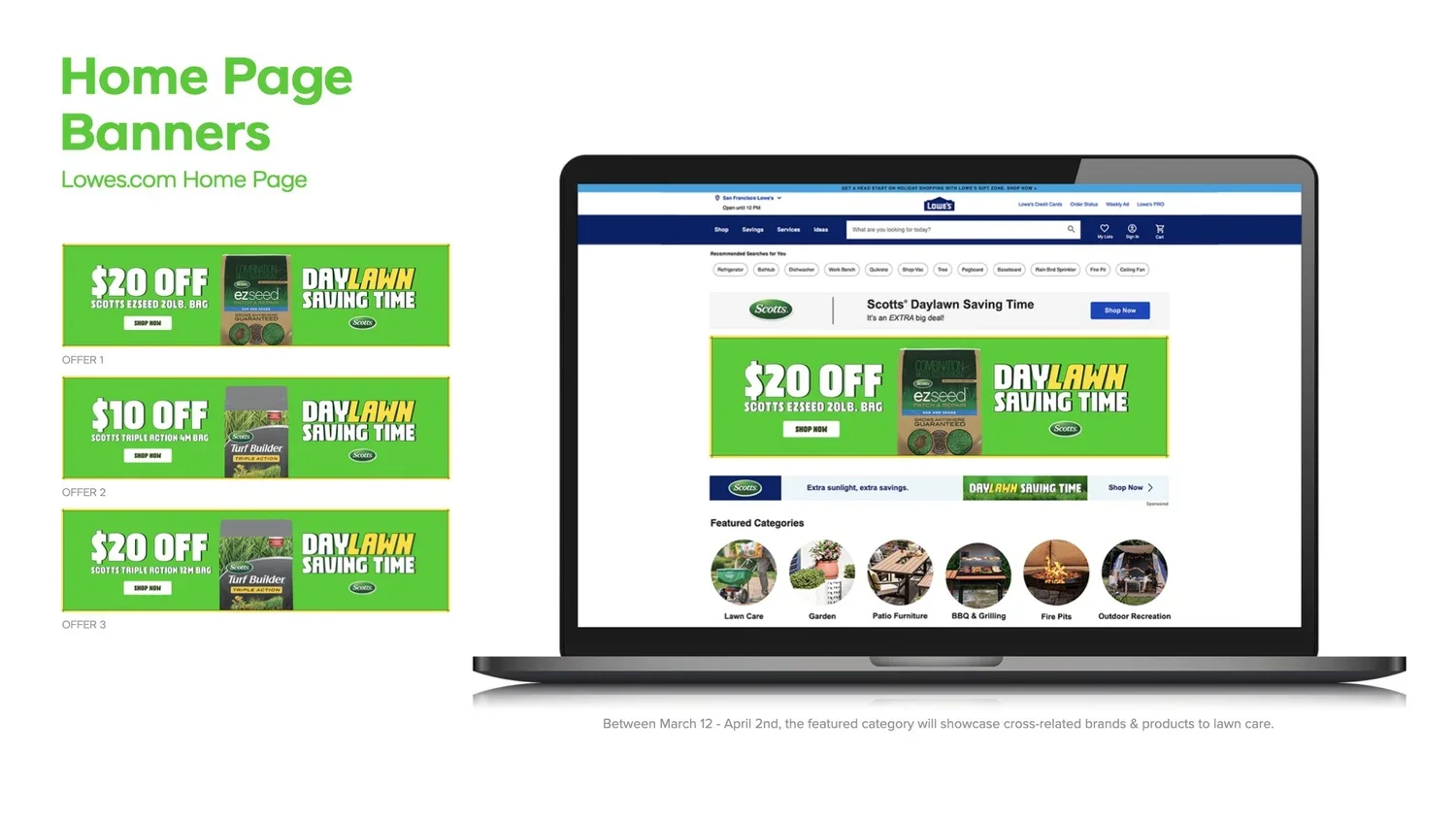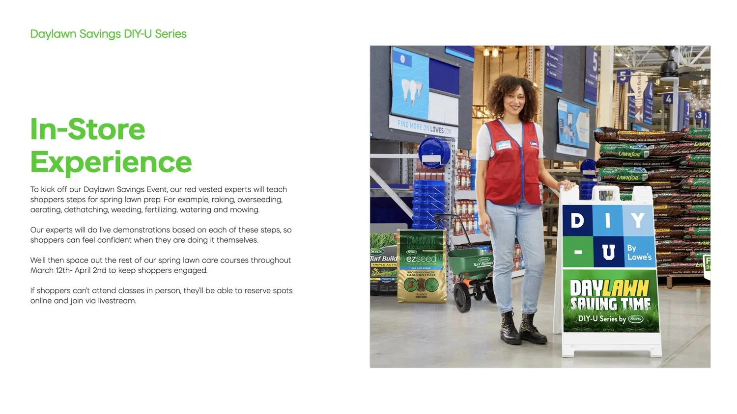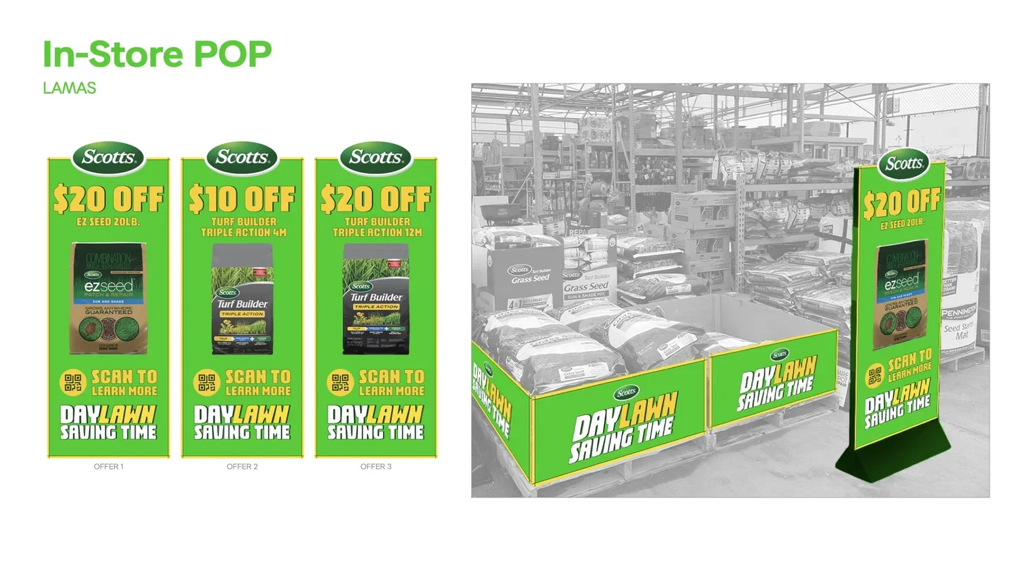 We brought Scotts’ Daylawn Savings campaign to Lowe’s, using the most obnoxiously eye-catching shade of green imaginable. It stopped shoppers in their tracks and drove them straight to the lawn care aisle.