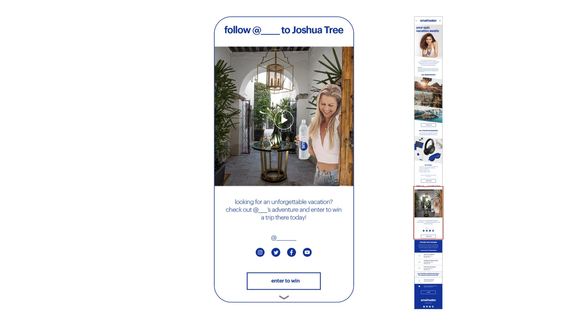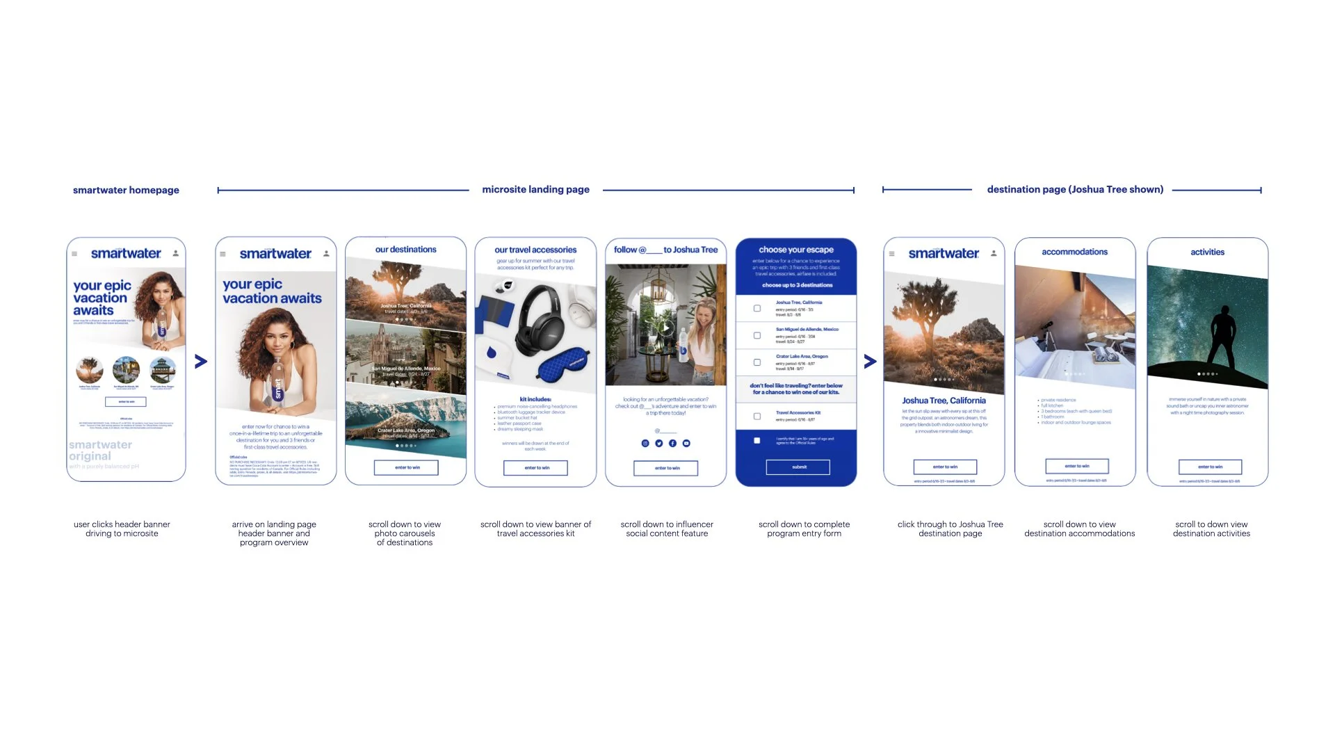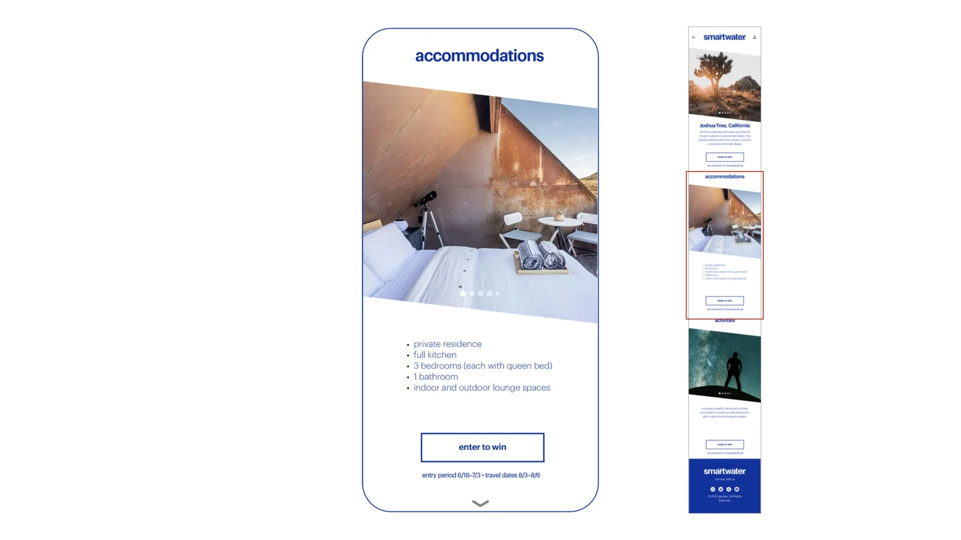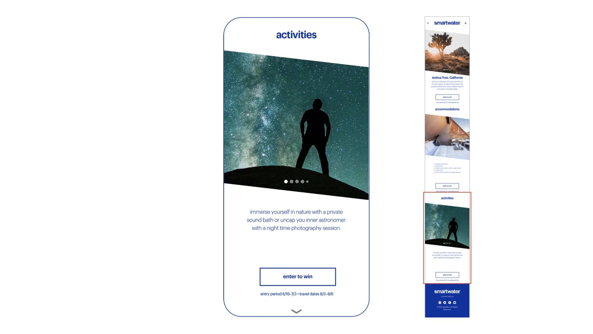 Smartwater is all about providing unconventionally smart hydration. So when they run a summer sweeps promotion, it has to be equally unconventional. To do that, we partnered with Modern Adventure to offer incredibly unique summer getaway experiences at a few truly unconventional destinations. To ground the campaign, we designed a sleek and modular microsite. The goal was to make it easy to navigate while remaining flexible for changing promotional content.