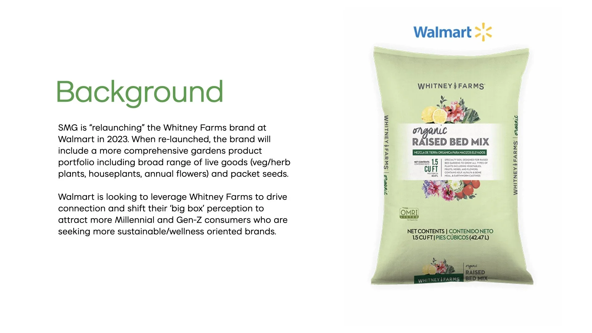 Launching Whitney Farms brand at Walmart in 2023 with a comprehensive portfolio of garden products and leaning into sustainable/wellness oriented shoppers.